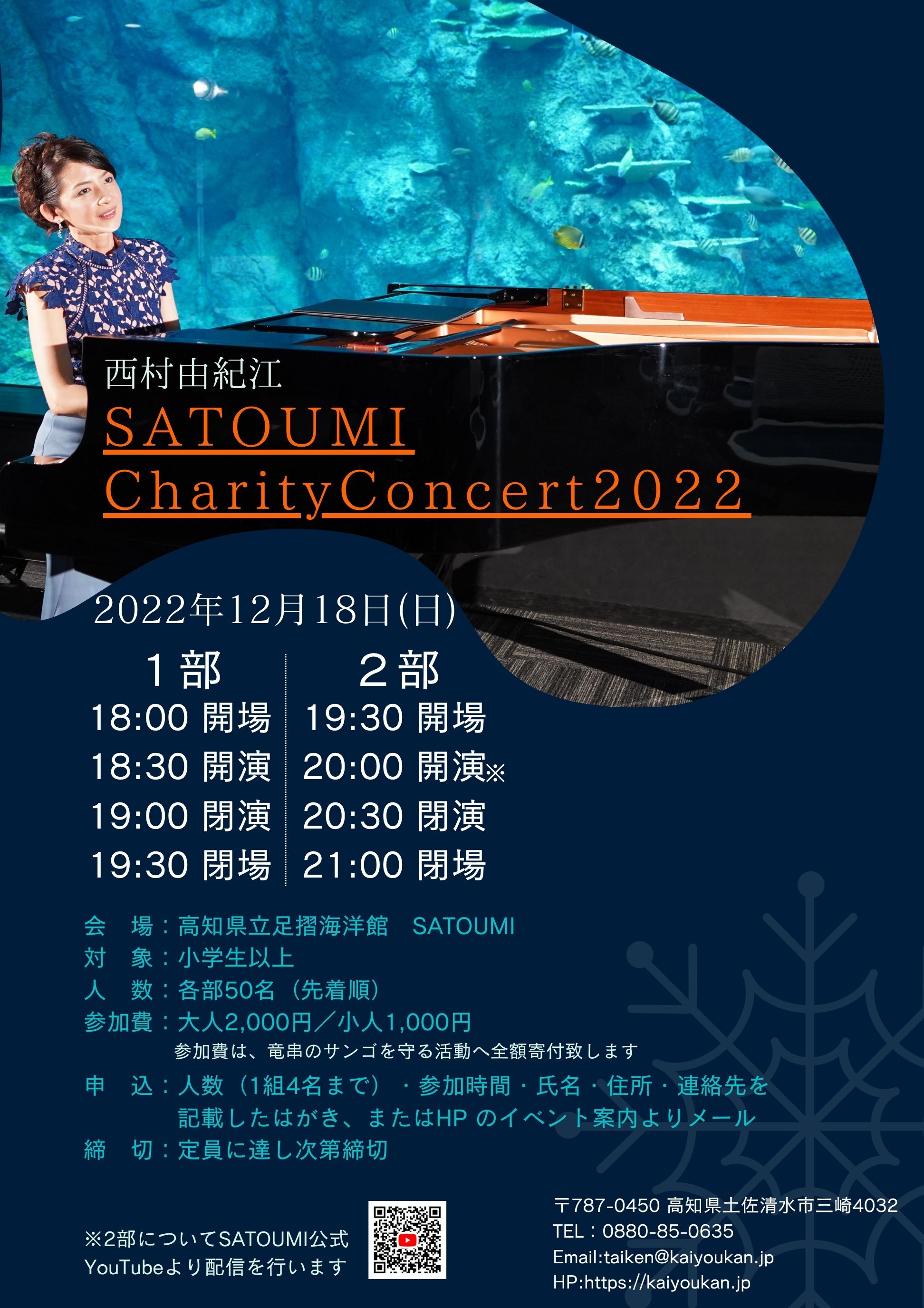 足摺海洋館 SATOUMI では、作曲家でありピアニストの西村由紀江さんから提供いただいたBGMを館内にて使用しており、そのご縁から昨年コンサートを開催しました。非常に多くの方から応募申込みをいただき、今年も西村さんと一緒に特別なイベントを開催出来ないかと考え、この度眼前に広がる竜串湾の環境保全につながる企画になるよう、参加費用を全額サンゴを守る活動に寄付する「西村由紀江SATOUMI サンゴ保全チャリティーコンサート2022」を開催することとなりました。