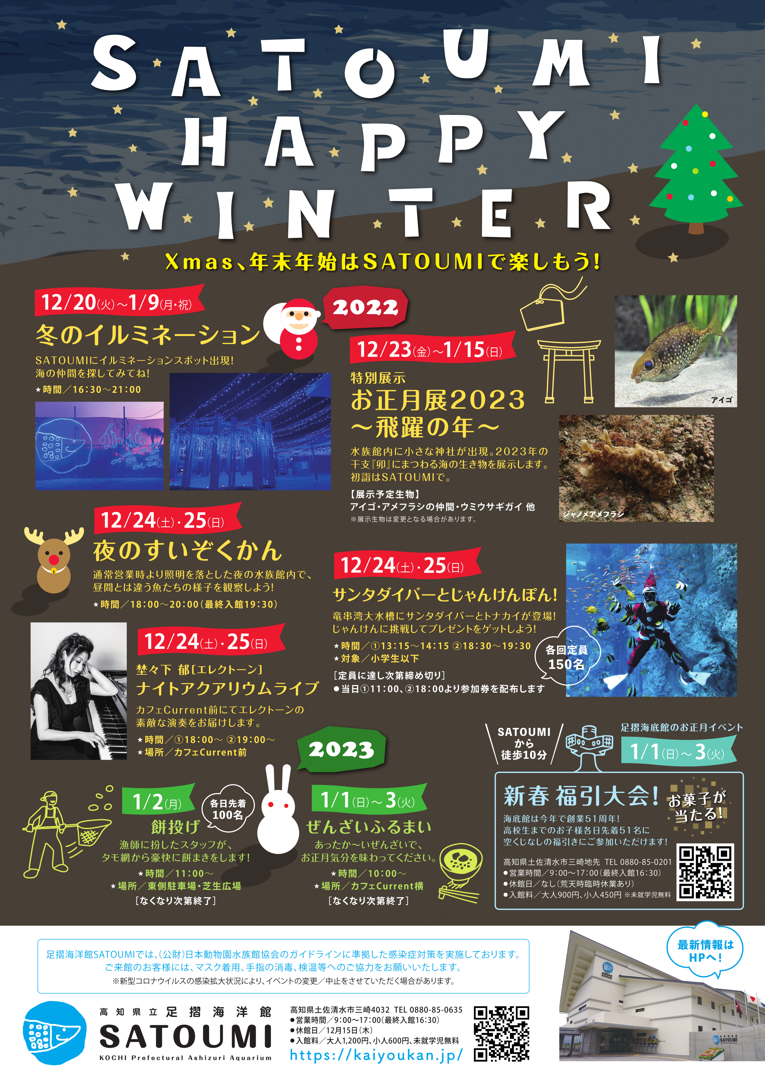 SATOUMIの竜串湾大水槽に、今年もサンタダイバーとトナカイがやってきます。じゃんけんに挑戦してプレゼントをゲットしよう!!通常の営業時間に加えて、夜のすいぞくかんでも開催されます。