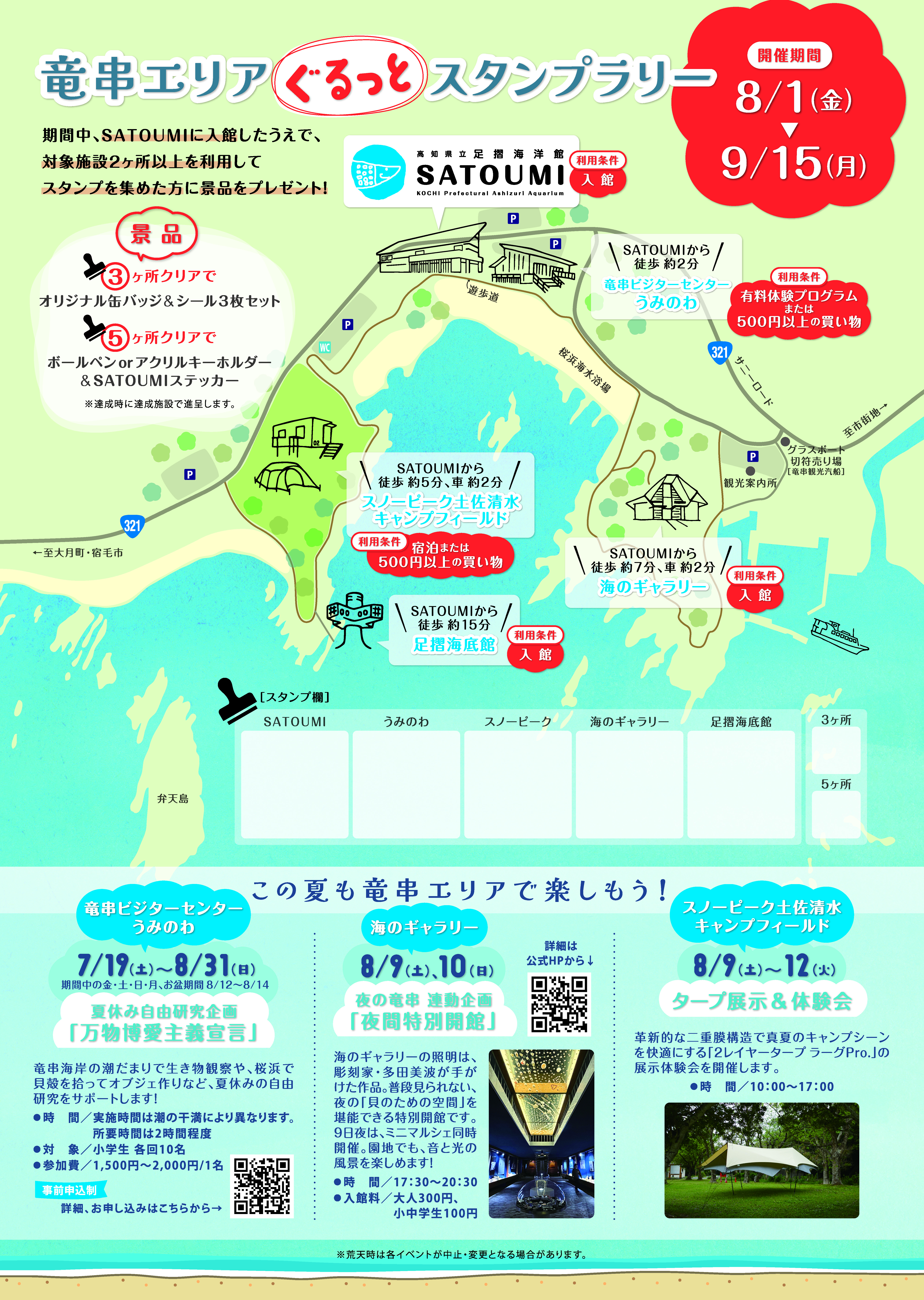 期間中に竜串エリアの各施設でスタンプを集めよう!スタンプの数に応じて景品をプレゼント!竜串エリアを周遊されるお客様におすすめのイベントです!