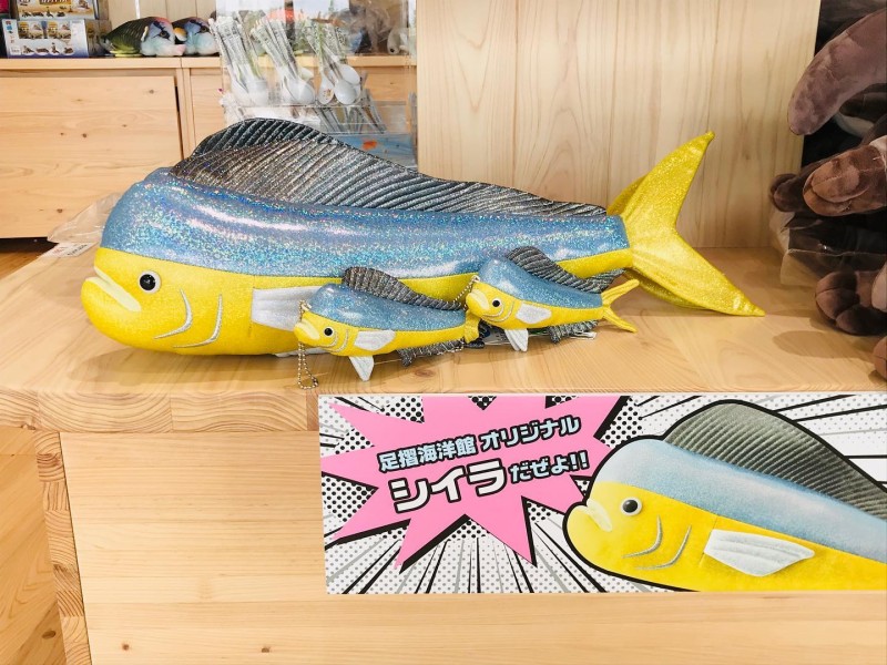 当館のショップには、シイラのオリジナルのぬいぐるみ(その名も「きらきらシイラ♂」)があるのですが、これまで展示できていなかったので、念願の展示となります。