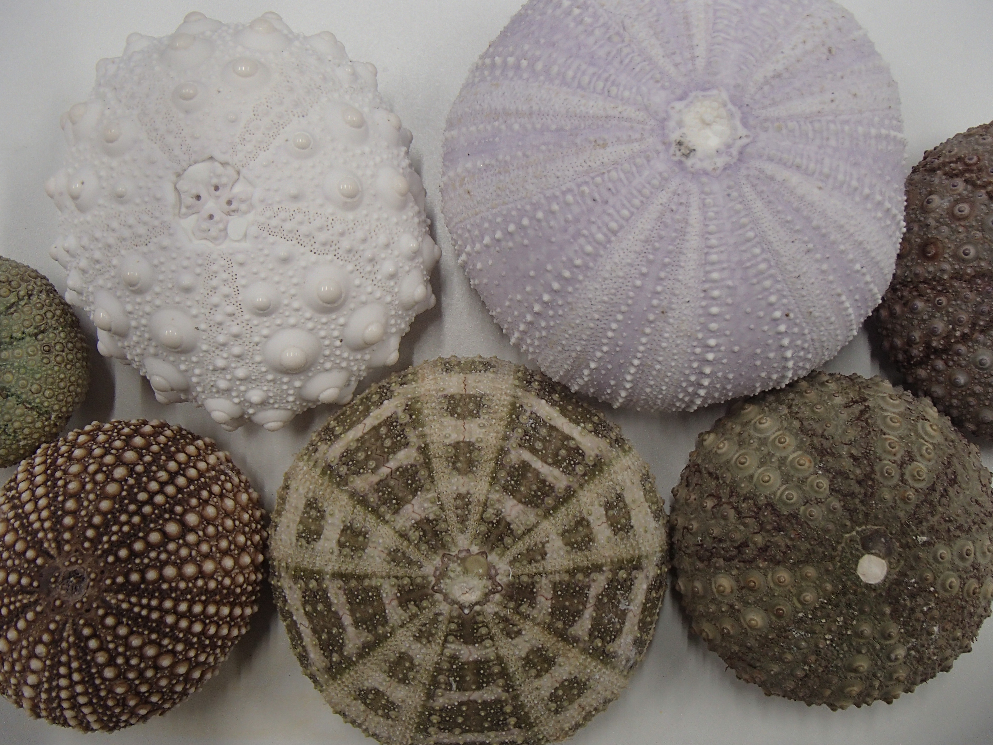 ウニの殻と呼んでいるのは、トゲが取れたあとの円い殻の部分のことです。その殻が種ごとに、形や色などが異なっているのですが、それが、それぞれの暮らし方などが反映されていて、なかなかにおもしろいのです。
