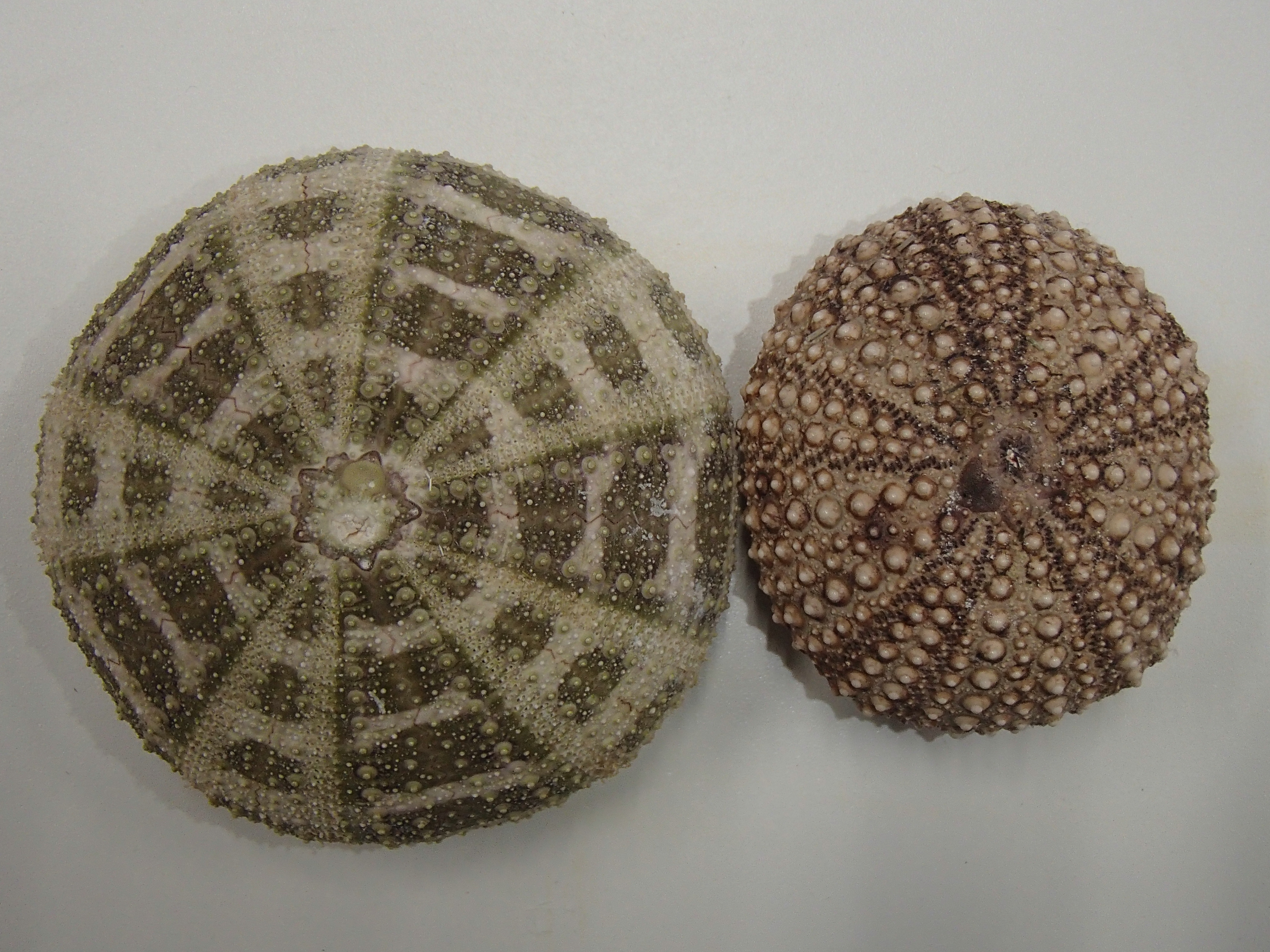 例えば、この辺りの浅い海で多く見られるツマジロナガウニは殻の形が楕円形をしていて、ナガウニという名前は、この殻の形からきているのだろうかと考えたり、岩を削って、自ら自分が収まる穴を作るとされるタワシウニでは、下側が細くなり、いかにも穴に収まりやすそうです