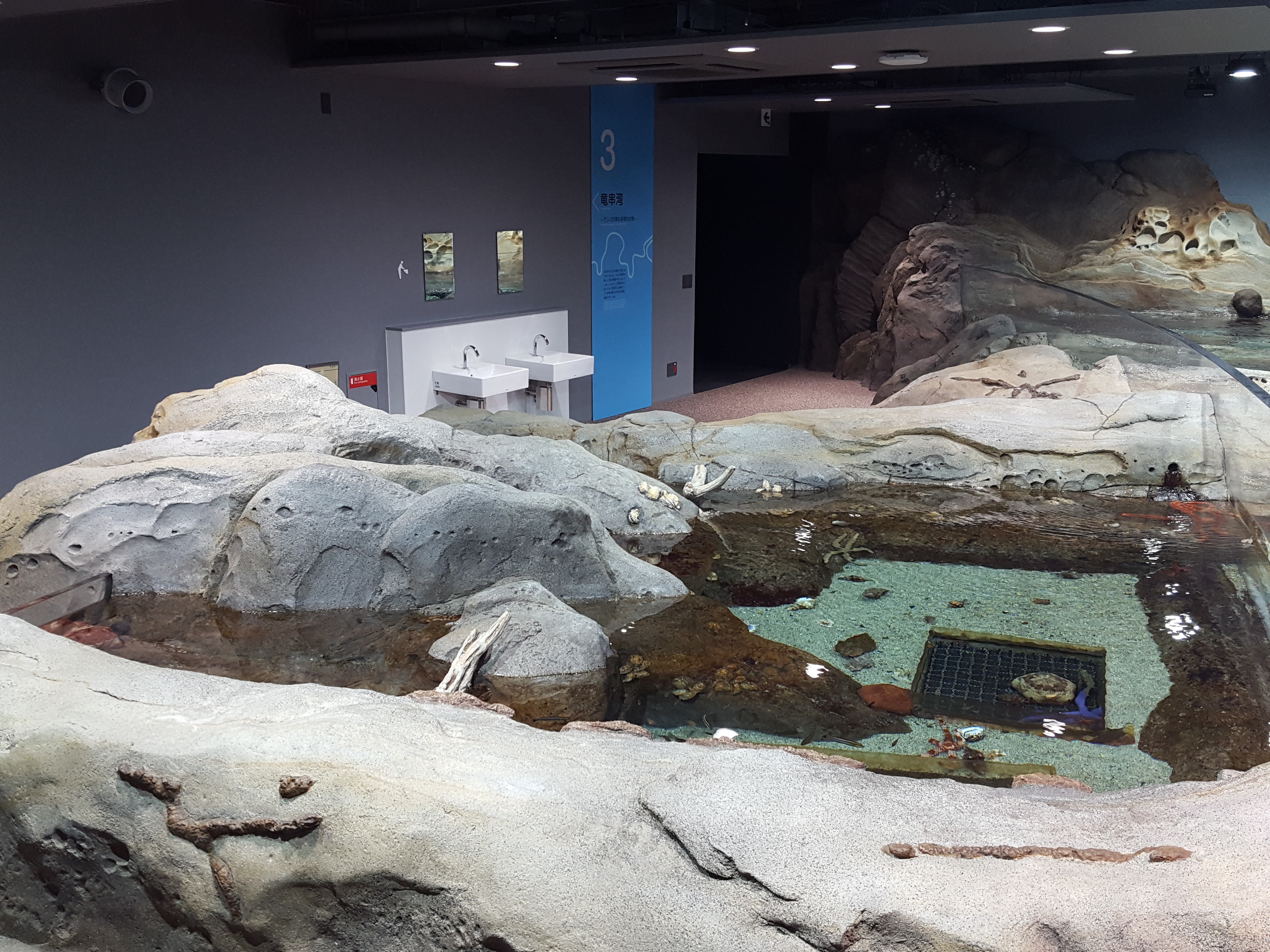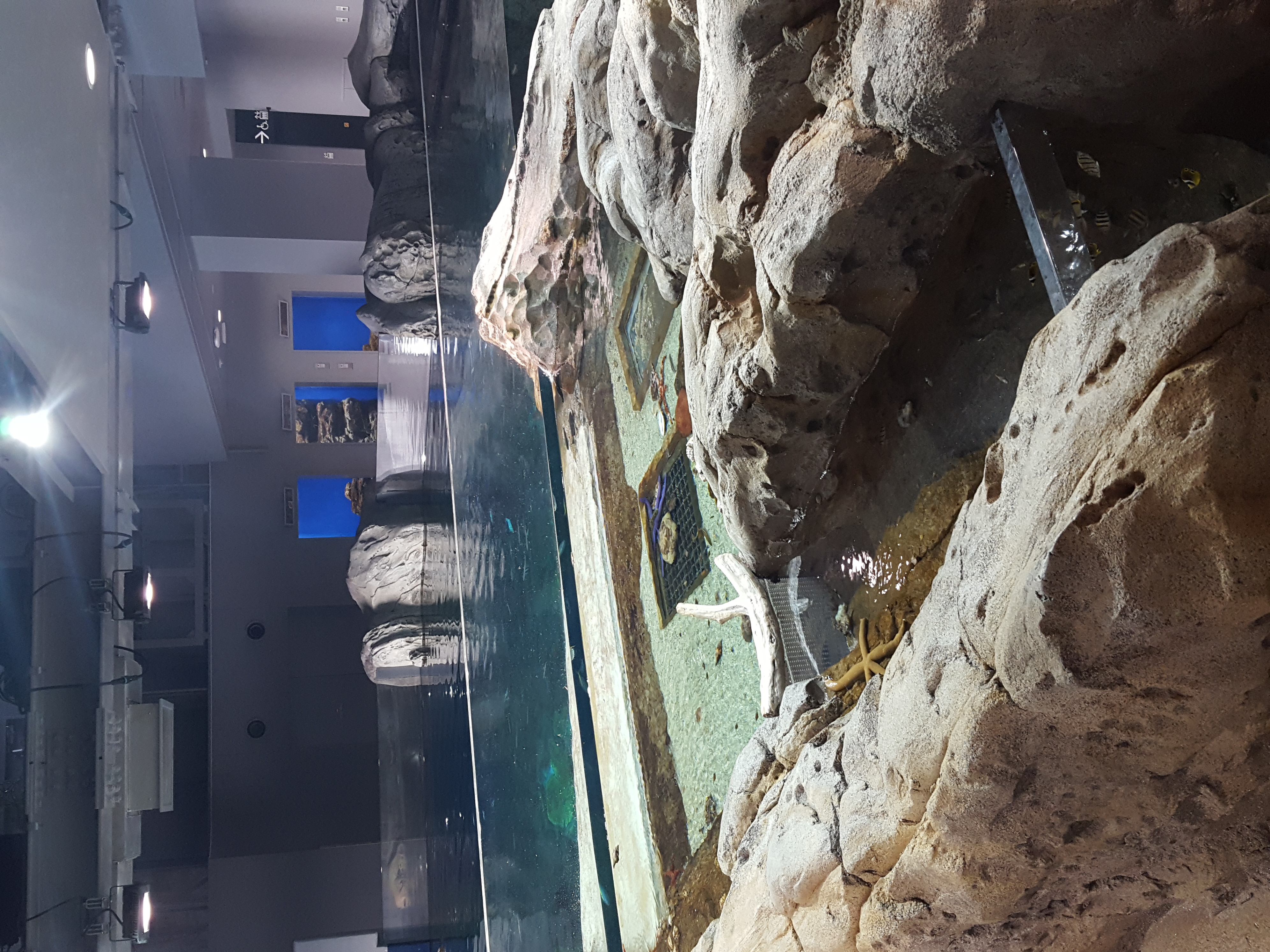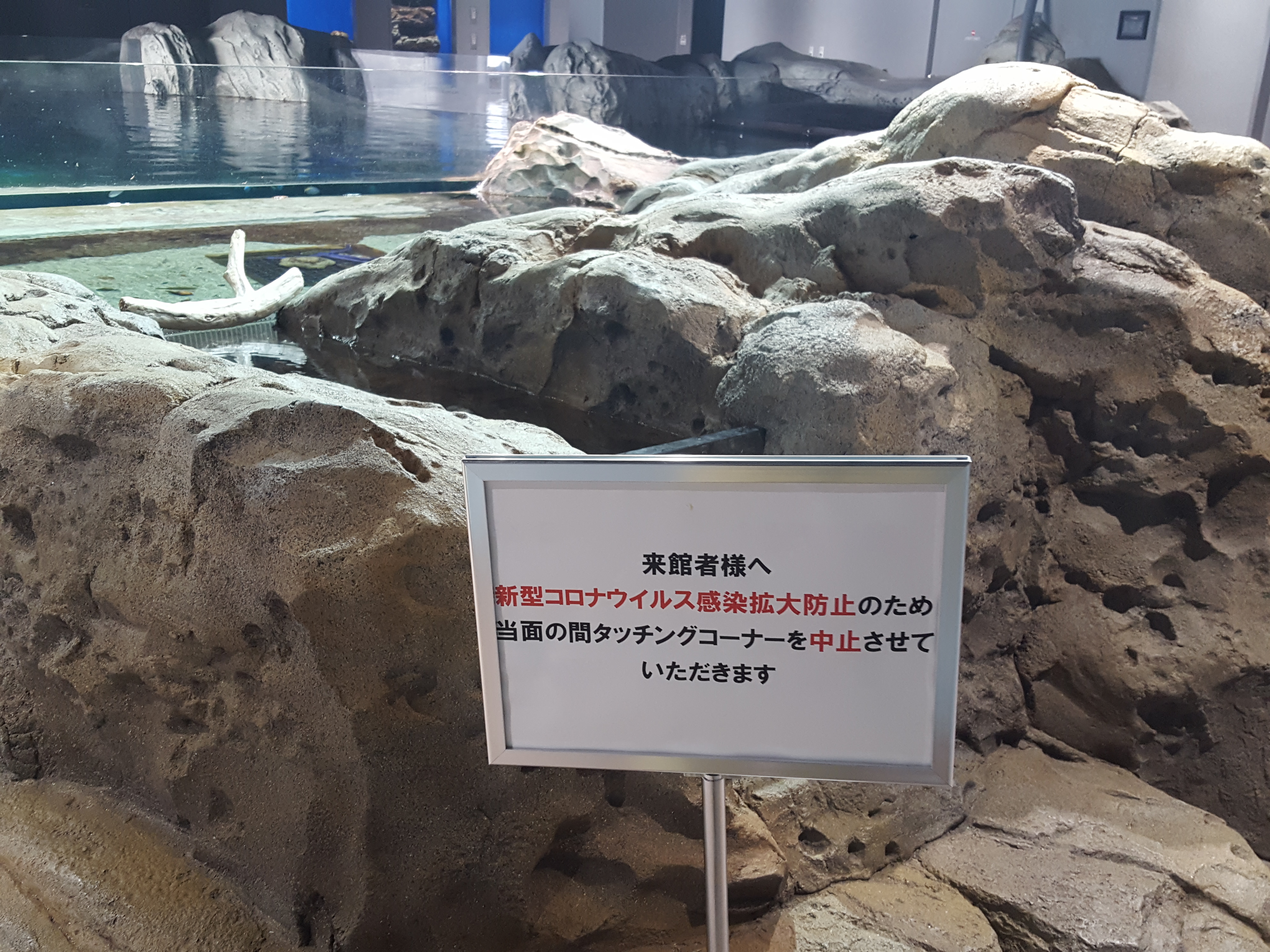 潮だまり水槽にはヒトデやウニなどに触れることのできるスペースもあるのですが、現在は新型コロナウィルスの拡散防止のため中止しております。