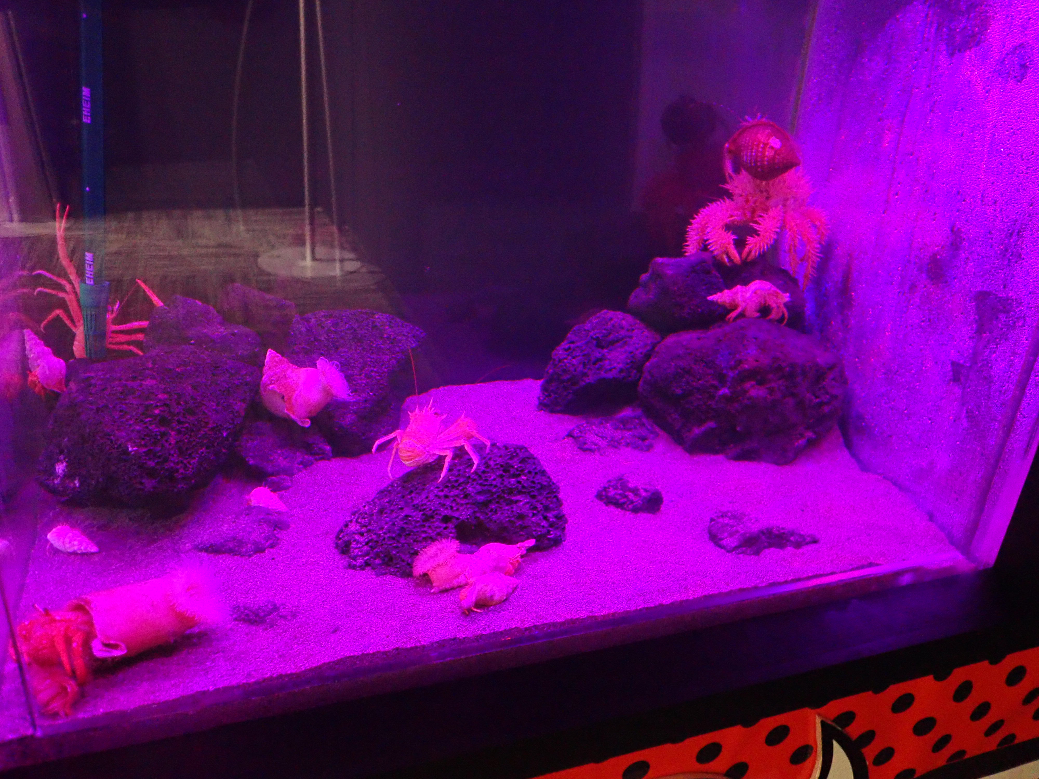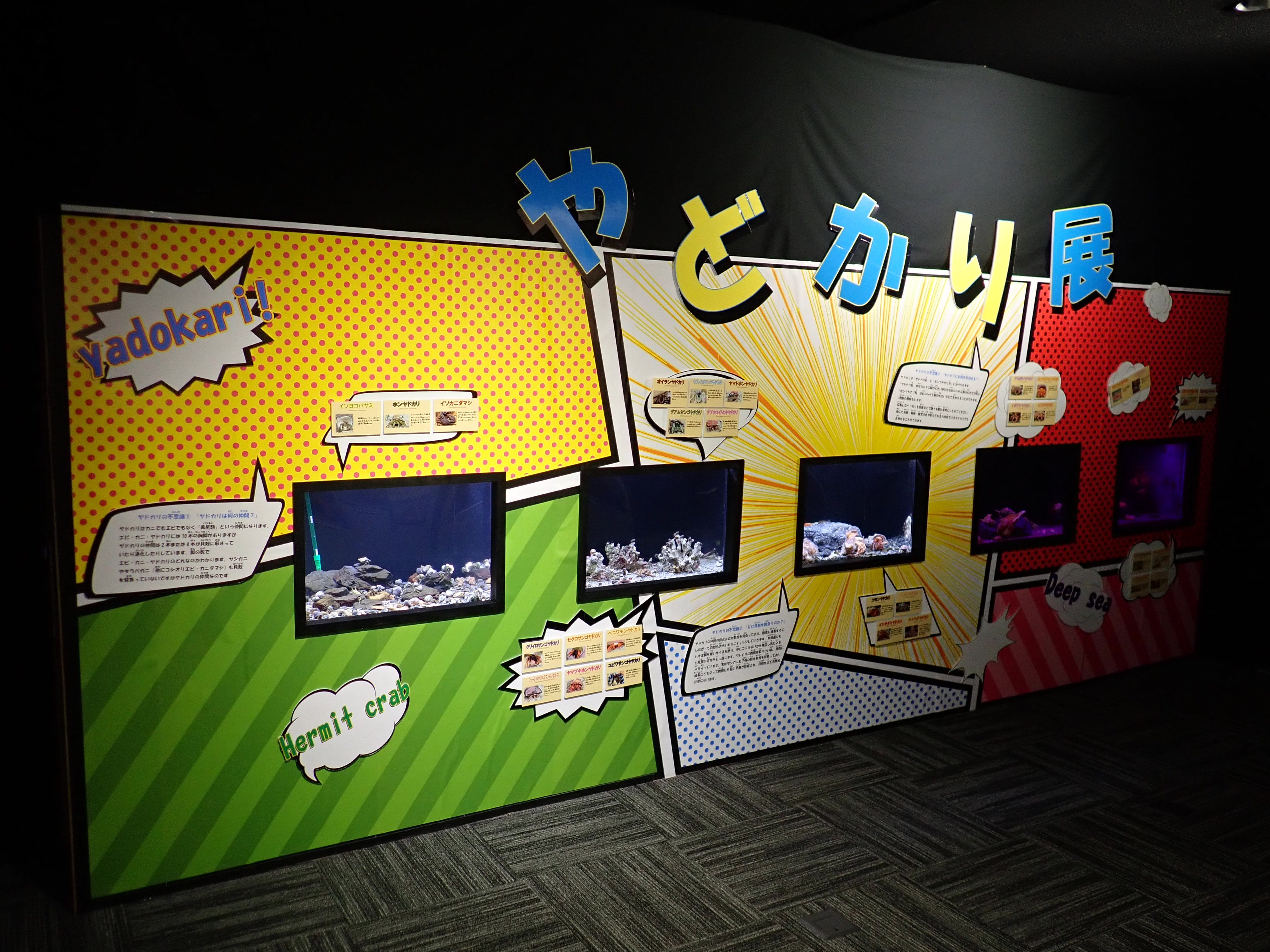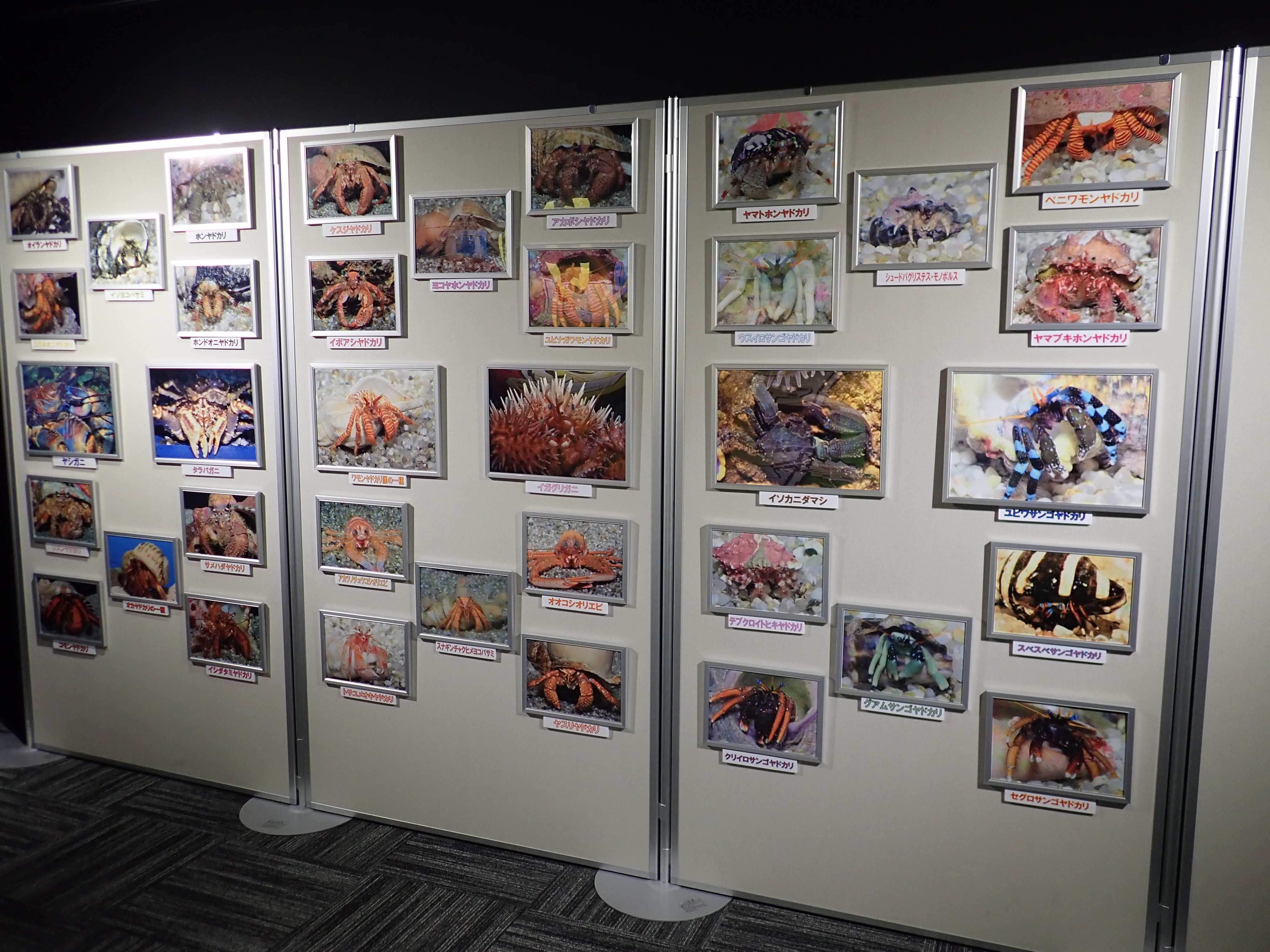 足摺周辺に生息しているヤドカリたちを写真と共に展示しています。身近な潮だまり(タイドプール)に生息している種類から、はるばる数百mの深海からやってきた深海ヤドカリまで個性的なヤドカリたち約30種類が大集合‼‼