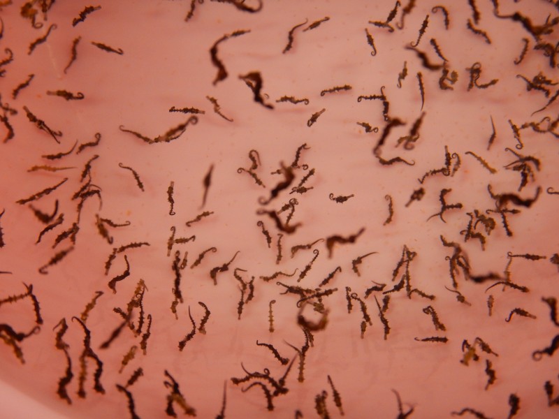 実は旧足摺海洋館の時にもクロウミウマの赤ちゃんが生まれたので飼育に挑戦しましたが150匹ほど生まれて大きくなったのは3匹だけでした。生まれた直後からエサを食べ始める為その時にどれだけエサを食べさせることができるのかがカギとなります。