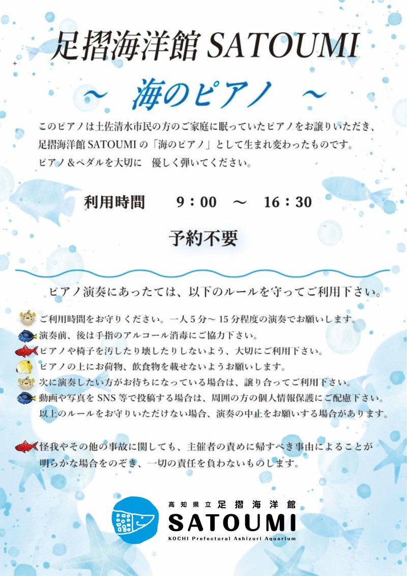 以前お知らせしました、足摺海洋館SATOUMI「海のピアノ」の運用方法の変更についてご案内いたします。