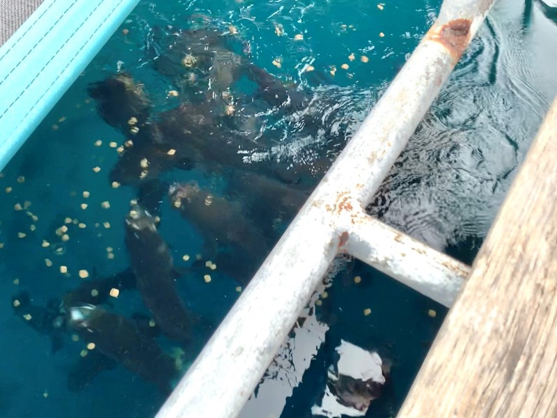 マダイの他にクエの養殖も行っており、給餌を見せていただきました。