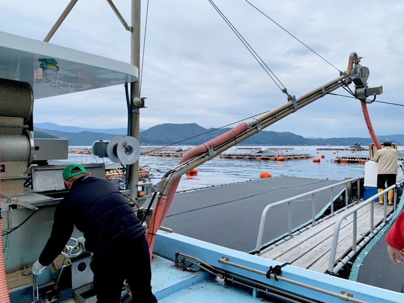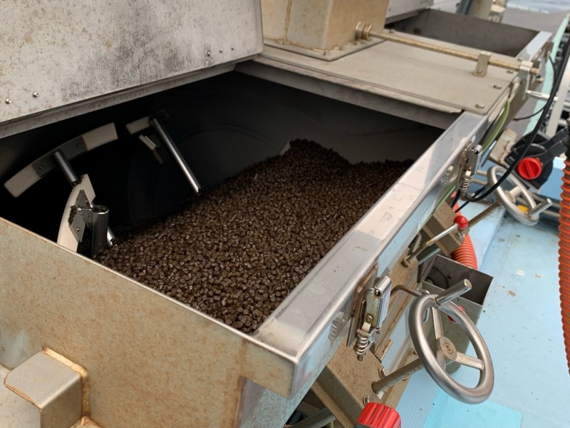 船上の撹拌機の中で、飼料に添加剤をまんべんなくまぶし、クレーンについたホースを通って生け簀に設置された自動給餌機に餌を補充していきます。