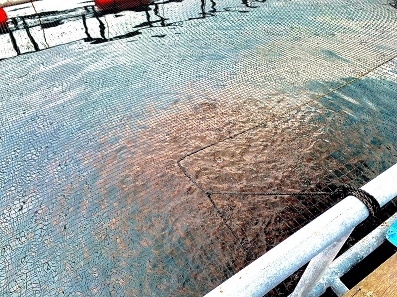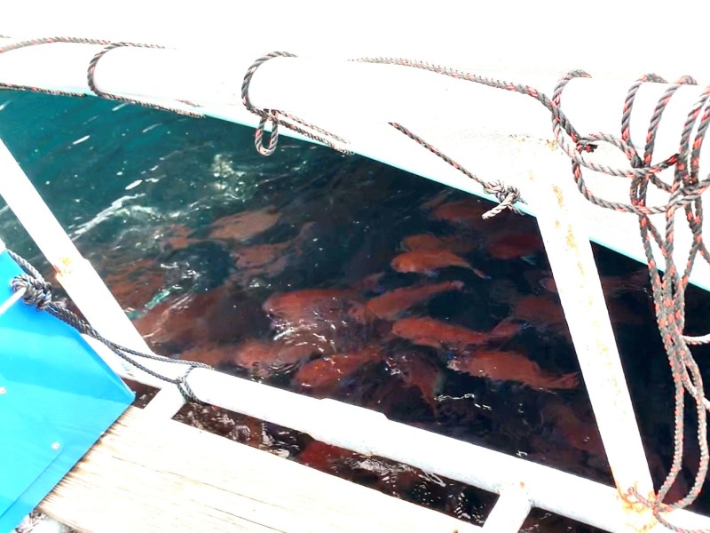 生け簀の中には約1万匹以上のマダイが泳いでおり、体が大きくなるに連れて密度が高くなる為数を分散しているそうです。