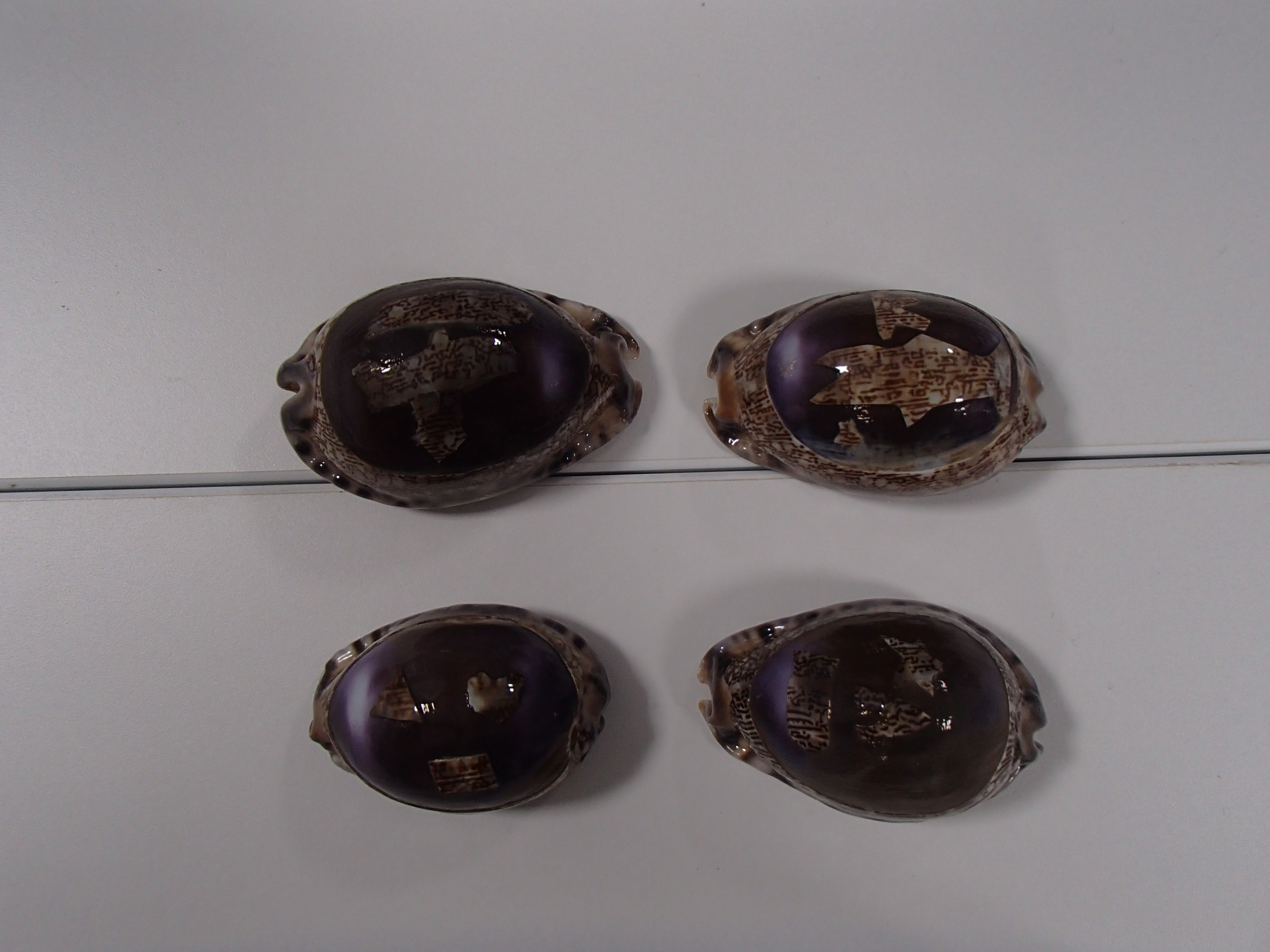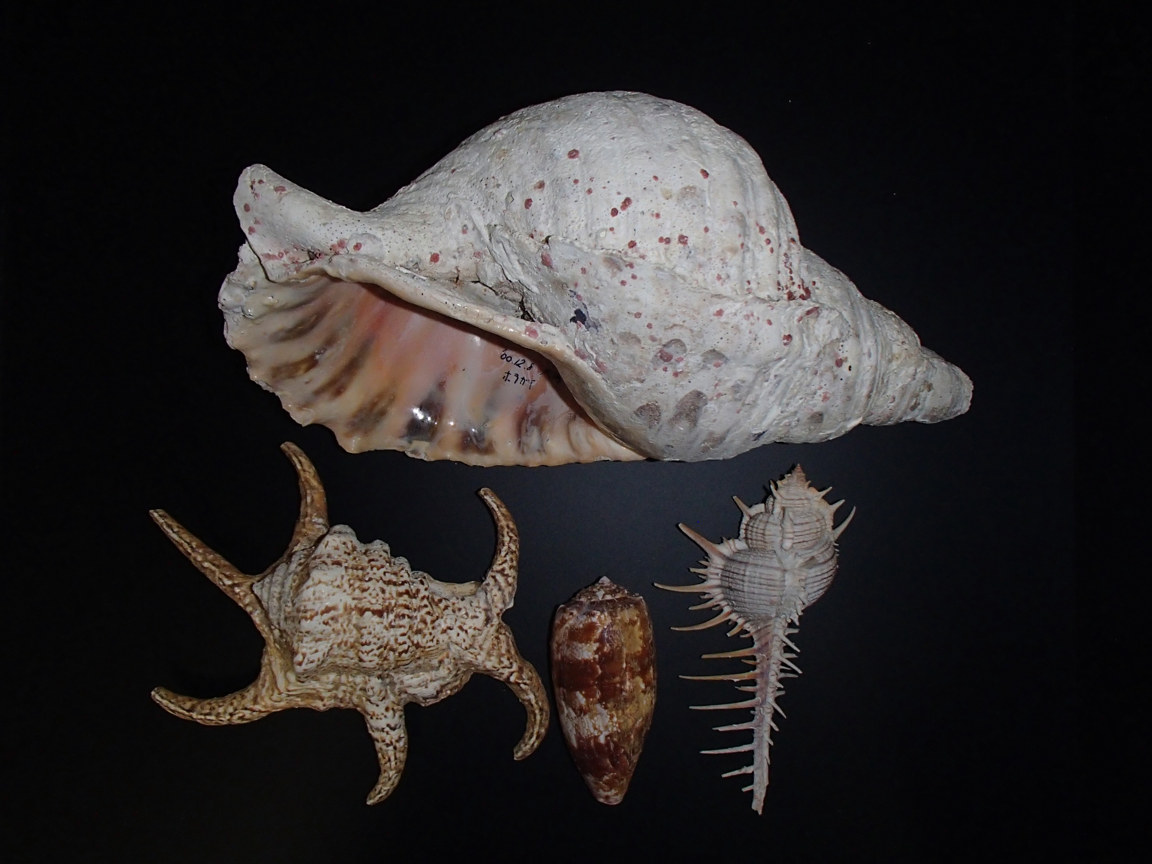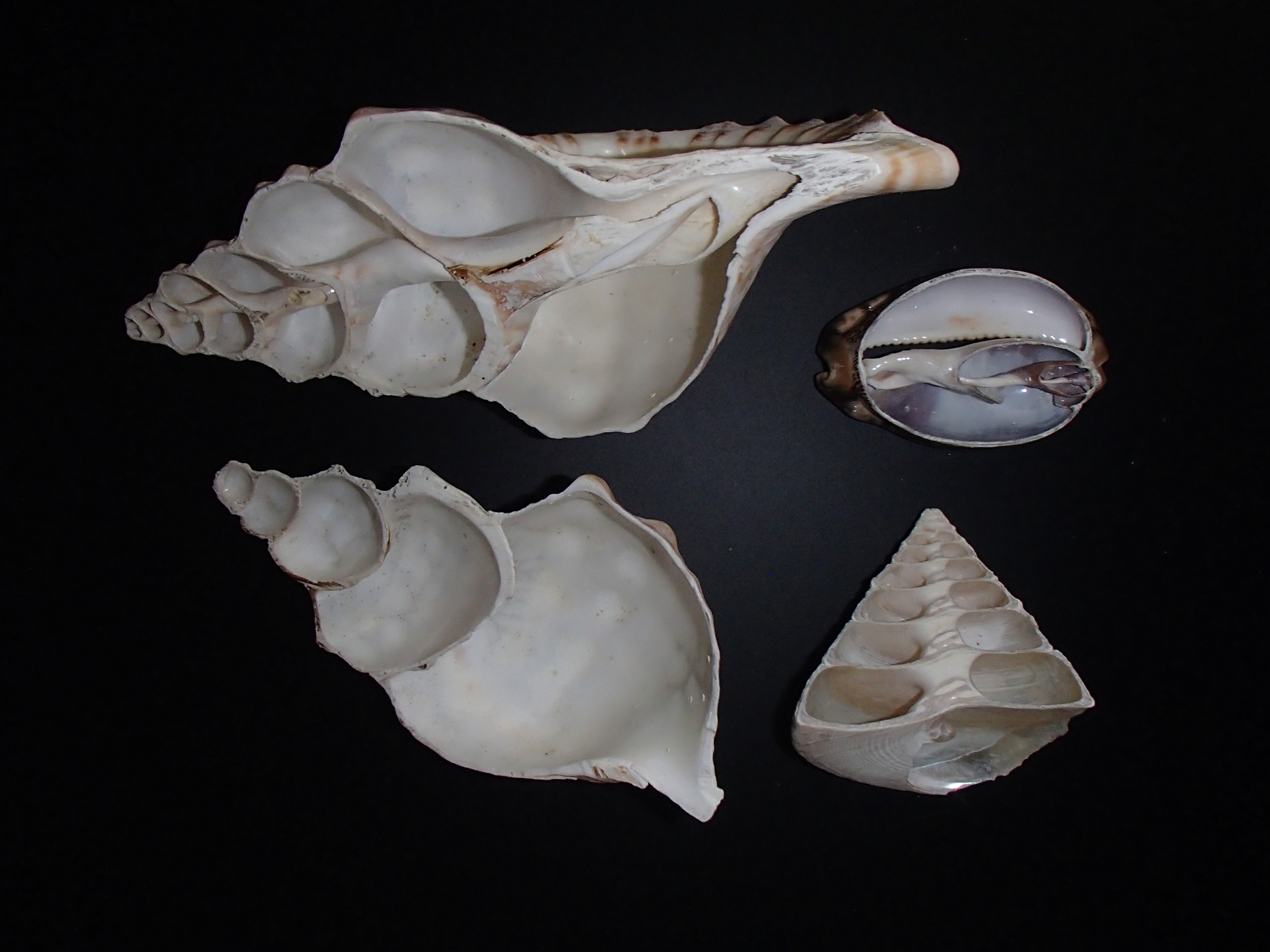 ・様々な貝殻 (上)ホラガイ(下)左からスイジガイ、アンボイナ・アッキガイ |