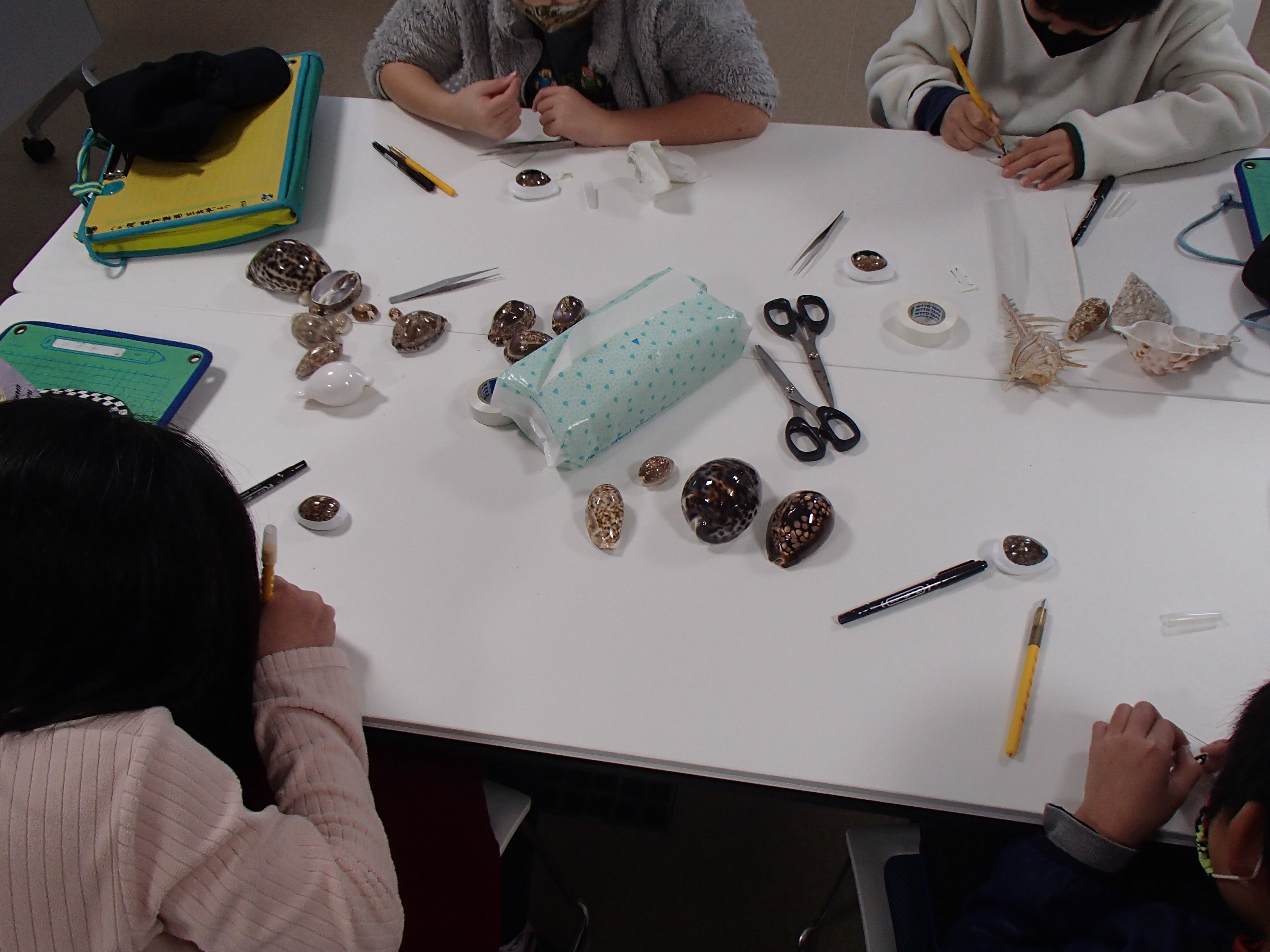 また、貝殻細工で使用するタカラガイの仲間についても、大小さまざまな種類や、幼貝では貝殻の形が異なることなども紹介し、貝という生き物について少しだけ触れてもらうことが出来ました。
