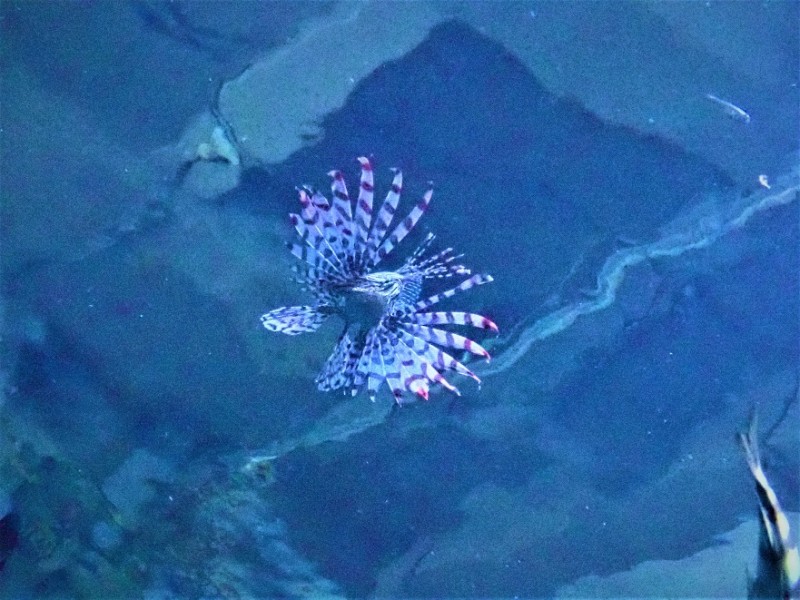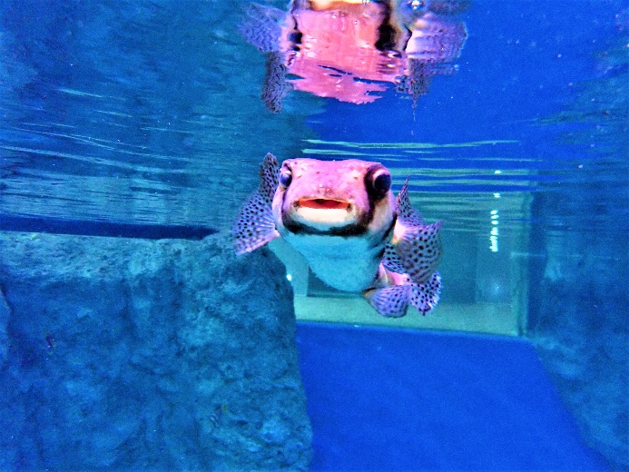 このフグはいつも水面を泳いでいるので、水槽正面より、大水槽の上側(2F)から探したほうが見つかりやすいかもしれません。