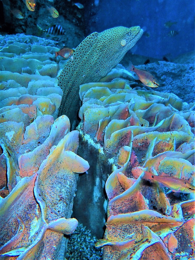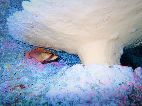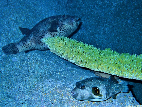 サンゴの陰で休むクロホシイシモチのペアやフグたち(上がモヨウフグ、下がサザナミフグ)…