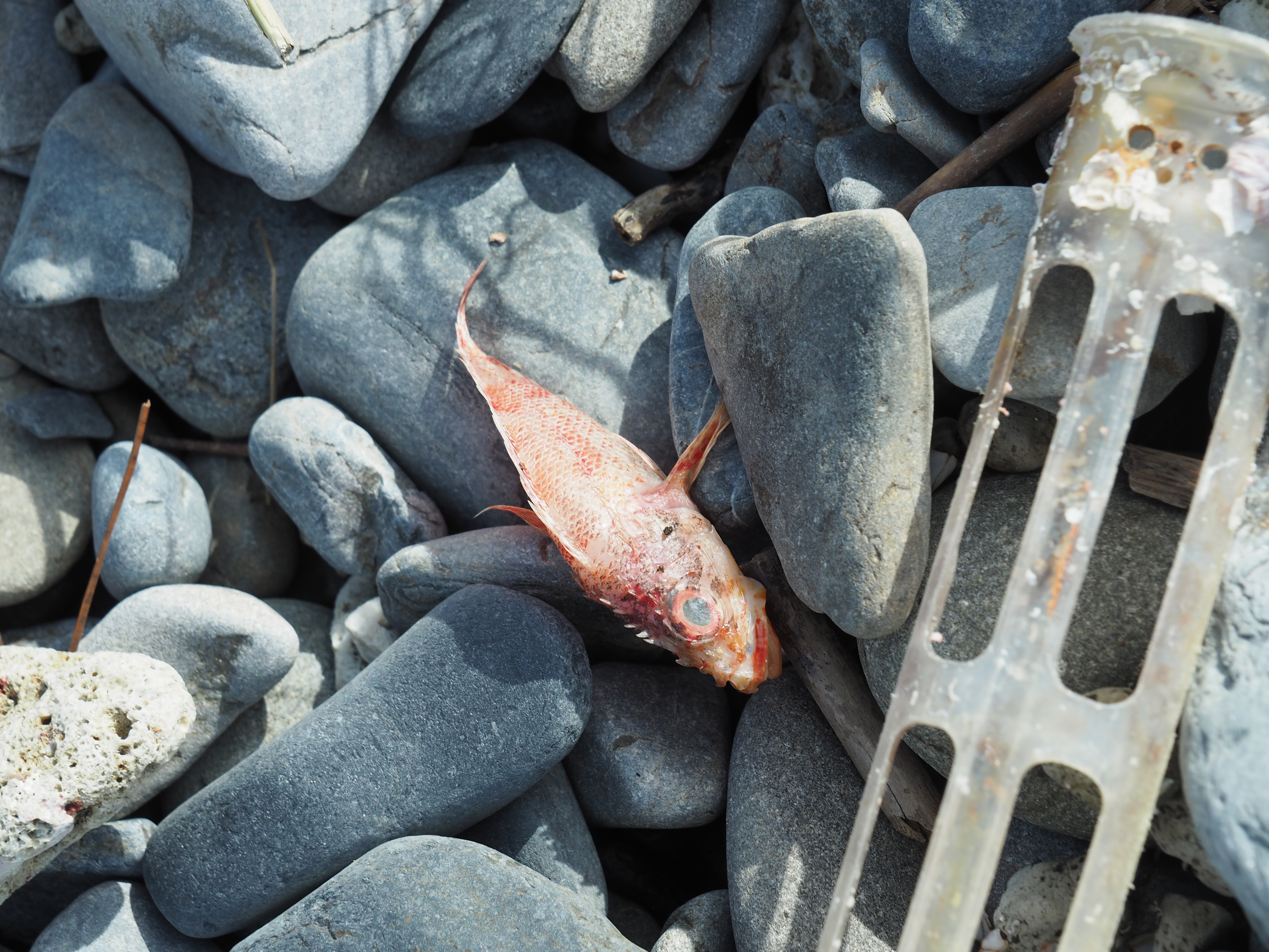 普段は波が届かないような場所まで波が来たため、ハマゴウのような海岸植物の葉が無くなり、枝だけの状態になったり、魚など様々な生き物たちが打ち上げられていました。