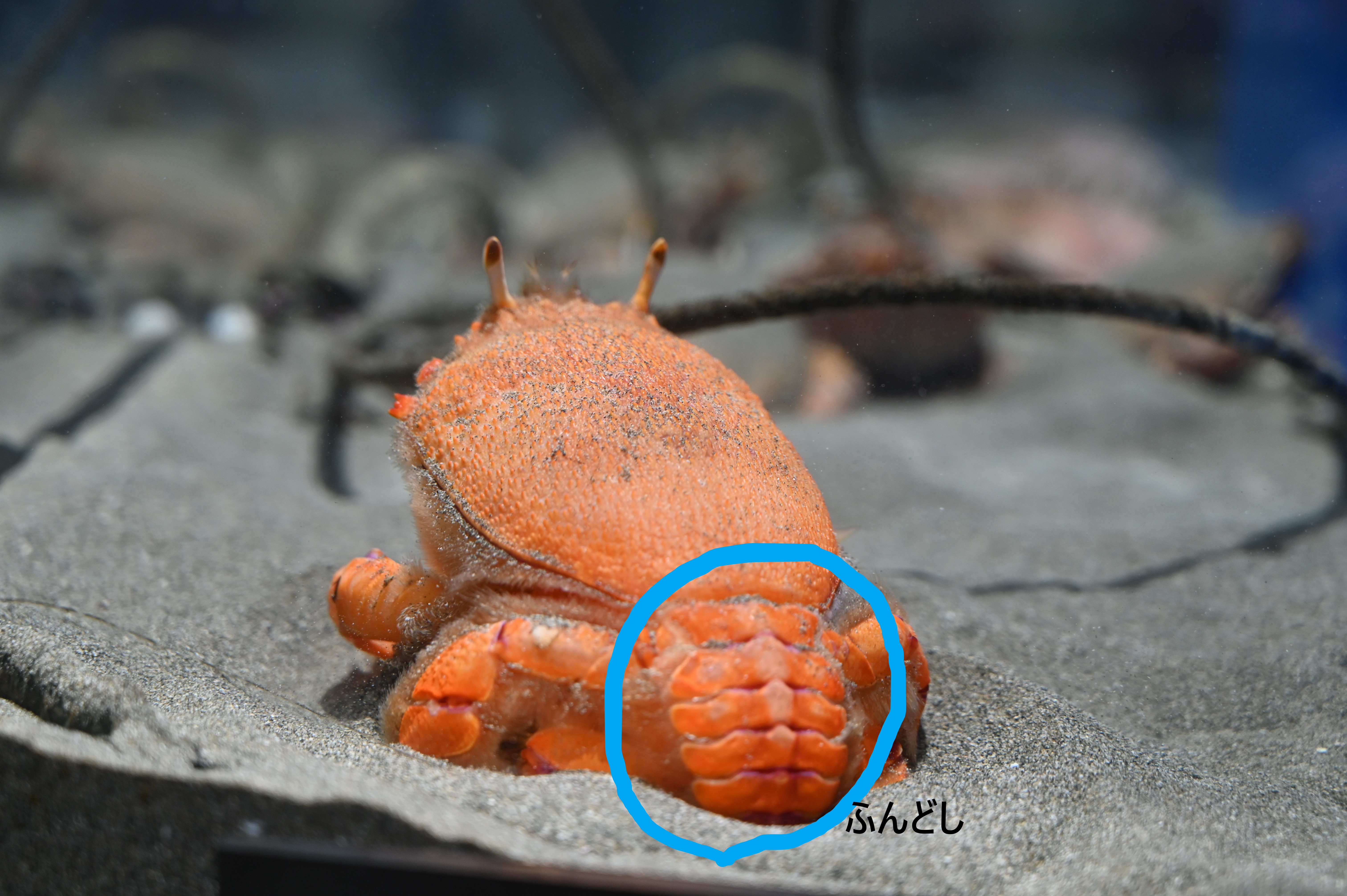 カニの中でも最も原始的なカニの仲間と言われていて、「ふんどし」と呼ばれる場所(腹部)が、他のカニと違って伸びたままという特徴を持っています。甲殻類の進化の過程で、ヤドカリの仲間からこのふんどしの部分を折りたたみ、カニの仲間へと進化していきました。しかし、アサヒガニはそれが不完全なのです。