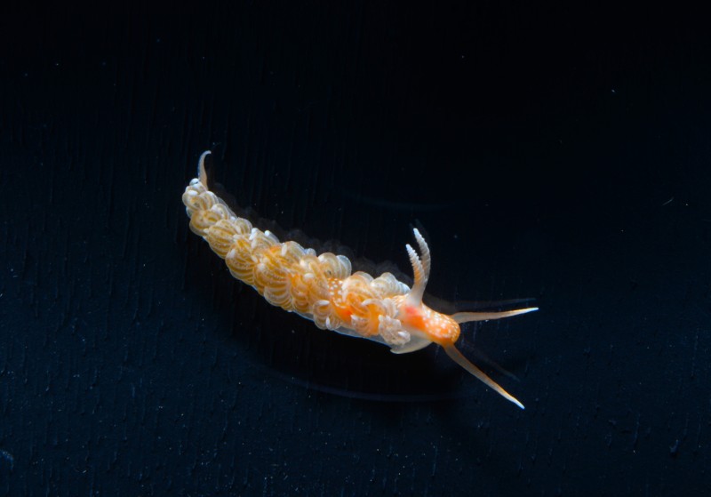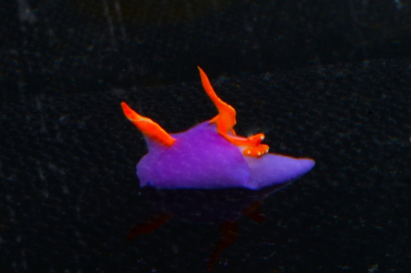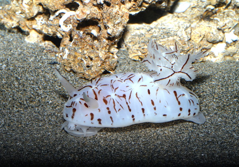 昨日から開催されている企画展「ウミウシのふしぎ」から、室戸の深層水をくみ上げたなかに混じっていた深海の美しいウミウシを紹介します。貴重な種でまだなんという種か判明されていません。ヨツスジミノウミウシ科には含まれる種のようですが、実際に標本を調べてみないと査定できません。水深300m以上の深海からやってきた珍しいウミウシ、是非見に来てくださいね。