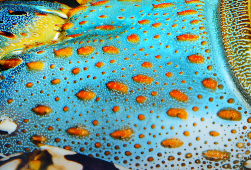 不思議な写真が撮れました。アクリル観覧面の前にいたので接写でパチリ!熱帯の珊瑚礁の海に沢山の島が散らばっているよう。なんだと思いますか?先日紹介した脱皮をして綺麗な体になった、ニシキエビの頭胸部のアップです。マクロにしてみると面白い写真が撮れますね。頭胸部全体の写真は2枚目ですよ。