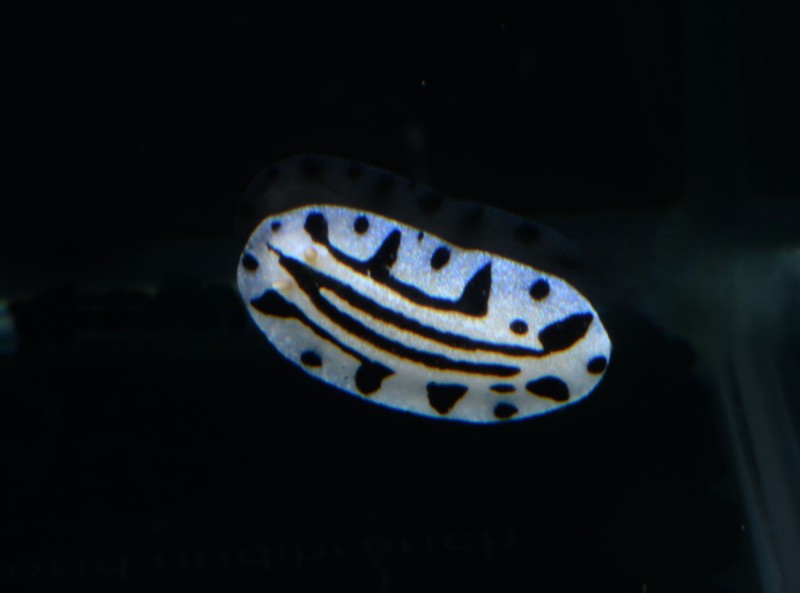 ウミウシコーナーの特設の小さな水槽の個性的なウミウシを紹介します。タテスジイボウミウシです。2㎝弱の大きさですが、幾何学的な模様でどちらが頭で、どちらが後ろなのかが一見して区別がつきません。ようく見ると黄色の触角がチョコンと一対並んでいるのが判ります。そちらが頭です。小さな生き物たちをじっくりと観察すると、面白い発見が沢山ありますよ!