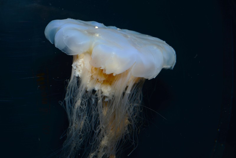 クラゲのコーナーにユウレイクラゲが展示されています。展示個体は殻の直径が10㎝強ですが、成長すると傘の直径は50㎝にもなり、触手の長さは10 mを超えるそうです。その長い触手や傘を隠れ家にして身を守り、ユウレイクラゲと一緒に漂っている魚がいます。ハナビラウオやイボダイなどの稚幼魚です。クラゲの持つ毒に守られて若い時代を過ごしているのです。