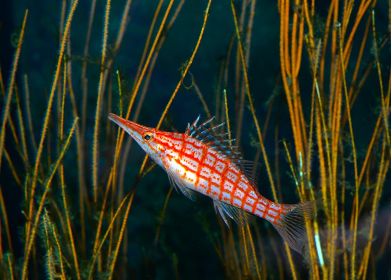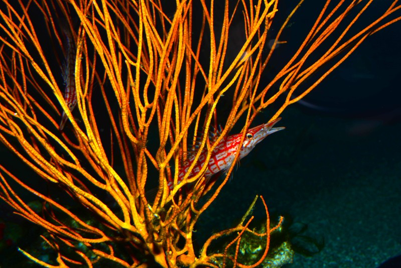 サンゴコーナーのヤギの仲間にクダゴンベとまっていたので、カメラを構えたら大きく口を開いて大あくび。といっても口が細長いので、鳥があくびをしているようですね。写真をよく見ると左の方にもう一匹クダゴンベが隠れています。判りますか?