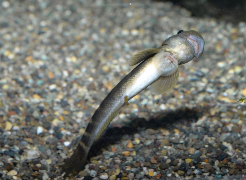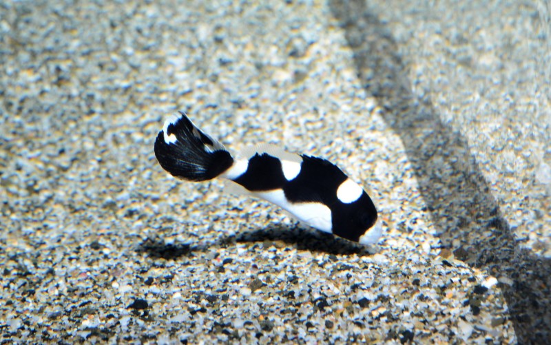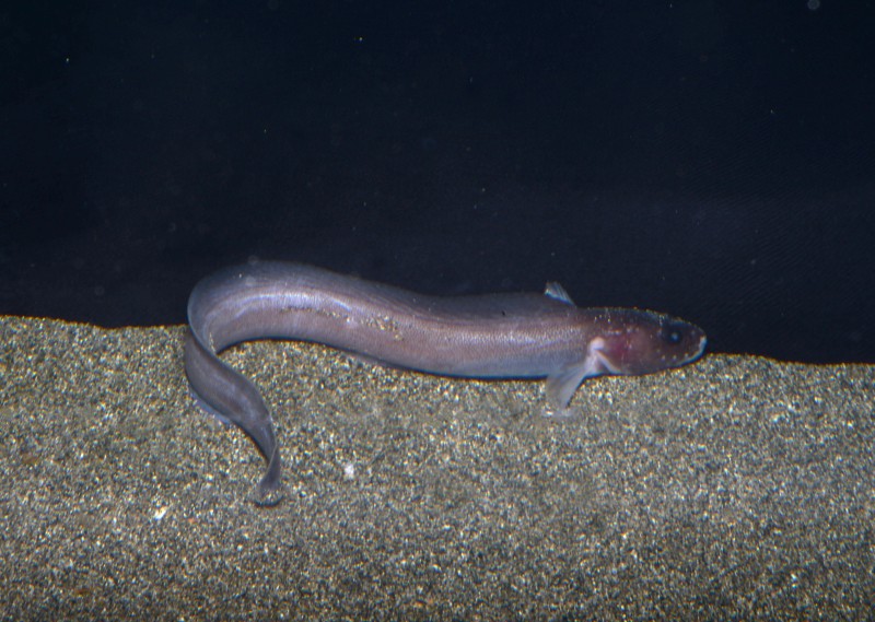 深海コーナーに珍しい魚が展示されました。アベゲンゲです。室戸の漁師さんがの水深600mもの深海に仕掛けたエビ篭に入ったものです。全長10㎝強の個体が3匹展示されています。黒褐色の顔が印象的です。ちょっと地味ですが、深い深い海の底からやってきたアベゲンゲ、是非見に来てください!!
