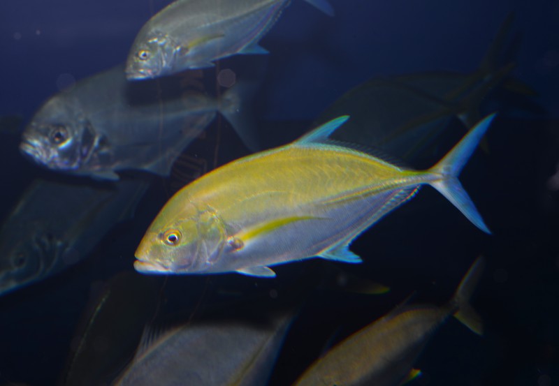 外洋水槽にカスミアジの若魚が展示されています。窪津の大敷網で収集された個体です。南方系のアジの仲間で、平たい体で、成長すると顔や背中にコバルトブルーの模様やラインが入りとても綺麗になります。胸鰭が黄色いのも特徴です。海外ではシガテラ毒をもつ個体が知られていて、古い図鑑などでは「ドクヒラアジ」と書かれたものもあります。