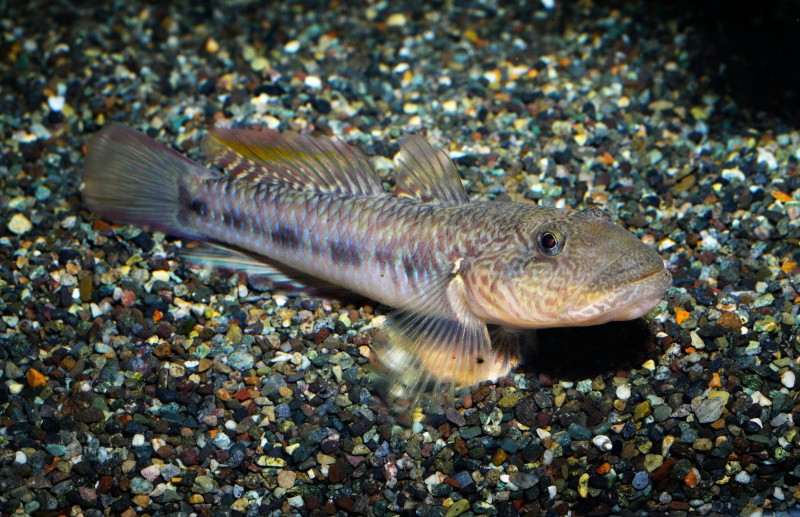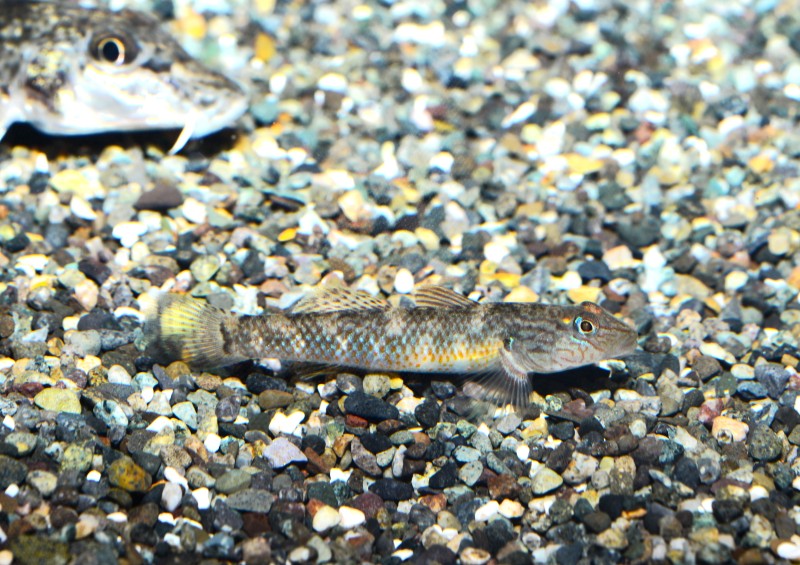 SATOUMI二階の、川の中流水槽でゴクラクハゼが立派な大人になっています。展示し始めた幼魚のころは二枚目の写真のようにシュッとした顔つきでしたが、今は体長10㎝を越え分厚い唇の厳つい顔になってしまいました。幼魚のころは河口近くの川で良く見られますが、成長すると純淡水域でも普通に見られるようになります。体の中央を走るブルーの斑紋の列が綺麗ですね。