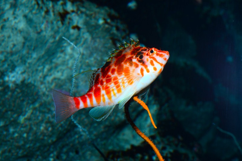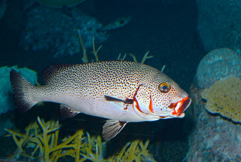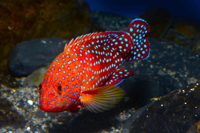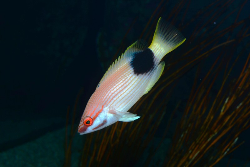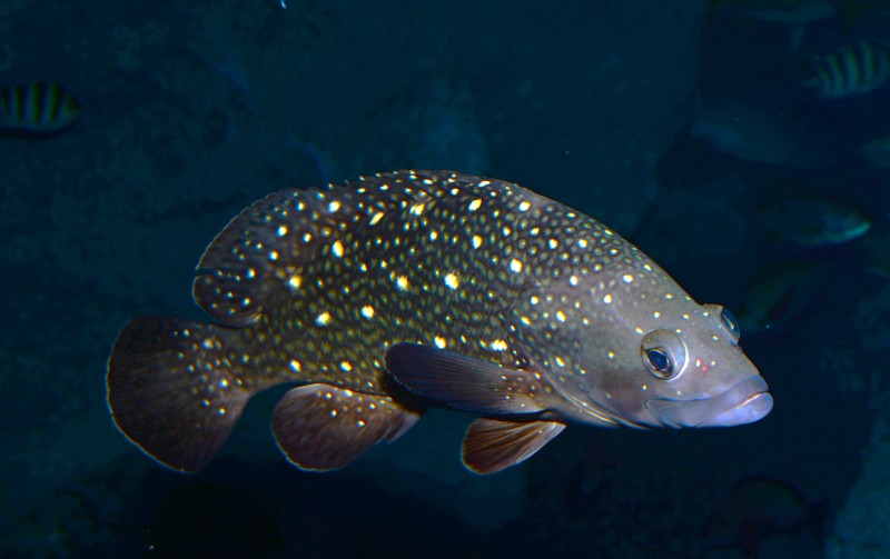 竜串湾大水槽には様々なハタの仲間が展示されていますが、岩やサンゴの陰に隠れていることが多くなかなかすべての種を見ることができません。そんなハタのなかでハクテンハタがアクリルの観覧面に近寄って来たので、撮影しました。体にはその名のとおり大小の白点が散在しています。なんかちょっとハタのイメージと違うなぁと思うのは、顔がシュッと尖っているからではないでしょうか。なかなかカッコいい顔のハタですよね!