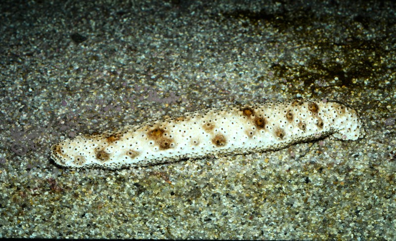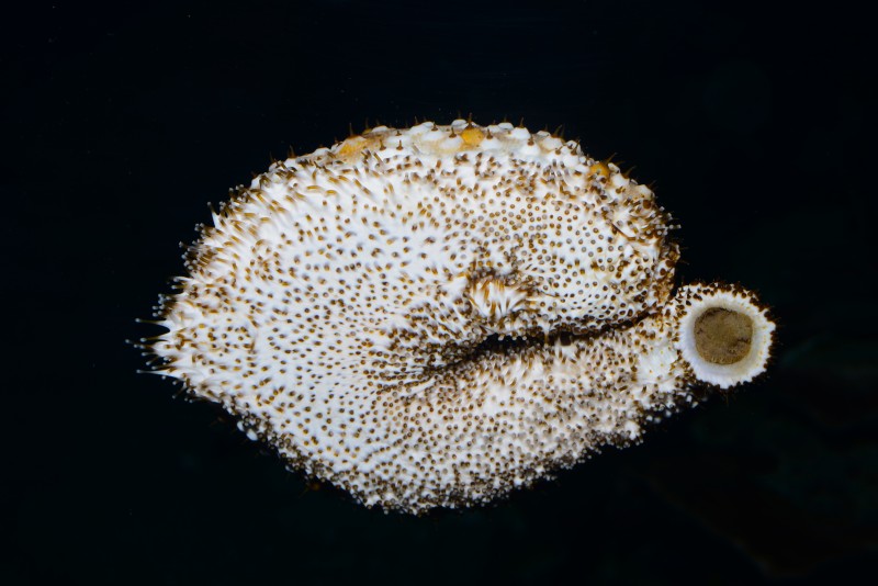 サンゴコーナーに入ってすぐ左のシコロサンゴが展示されている水槽のアクリル面に、トラフナマコが張り付いていました。体をUの字に曲げて、右の丸く開いている所が口です。この口で海底の泥や砂を飲み込んで、その中の有機物を食べています。そして綺麗になった泥や砂を、うんちとして海底に戻す海の掃除屋さんなのです。どんな体かというと、二枚目の写真のように白い体に濃褐色の斑点があるちょっとオシャレなナマコなんですよ。