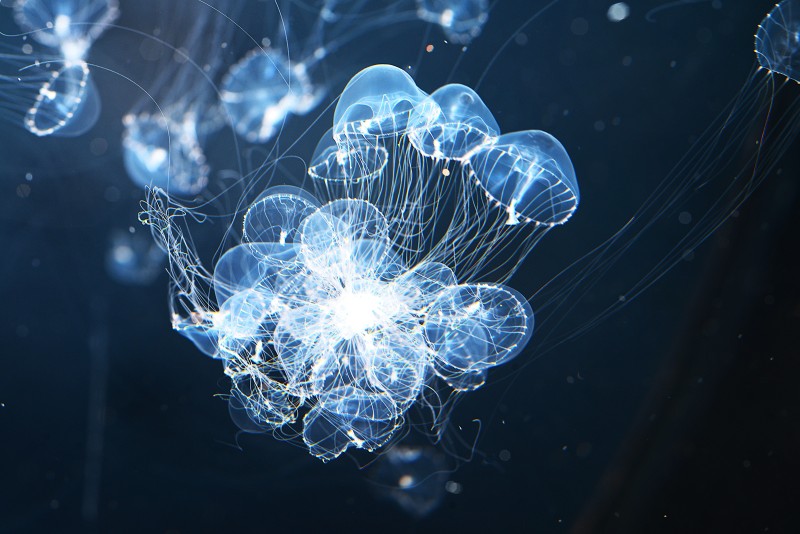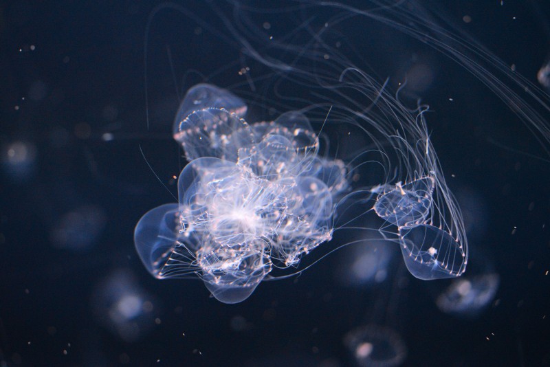 クラゲコーナーで餌のプランクトンを給餌した後、ギヤマンクラゲが大変なことになっていました!餌を求めて複数の個体がお互いの長い触手が絡めてしまい団子状態に。いつもこんな状態を見ると、ちゃんとほどけるのか心配になるのですが、二枚目の写真のように一匹、二匹と塊から離れていって、いつの間にかふつうの状況になっていましたよ。