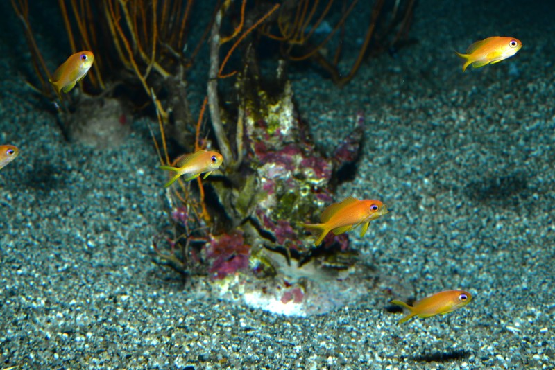 サンゴコーナーでミナミゴンべがムチヤギの先の方にとまってジッとしていました。ちょっと下から仰ぎ見る魚も綺麗ですね。でも、細いムチヤギだと不安定だと思うのですが。見ている間は安定してとまっていました。ゴンべの仲間は浮袋がないので、中層を泳ぐのが得意ではなく、すぐに着底してしまいます。