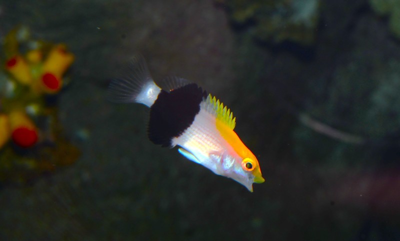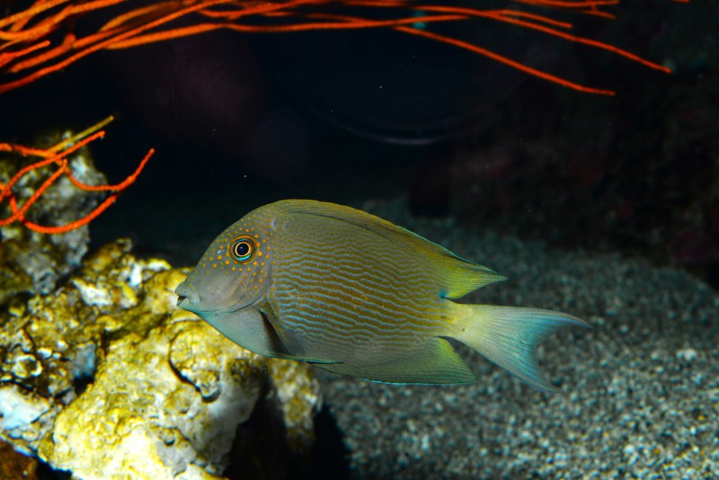先日紹介したクダゴンベと同じ水槽のサザナミハギの綺麗な写真が撮れました!目の周りのオレンジ色のスポット、身体に走るサザナミ模様がとても綺麗です。名前に「ハギ」とつくとカワハギの仲間のように思えますが、二ザダイの仲間です。その証拠に尾鰭の付け根近くに鋭いトゲを隠し持っているんです。