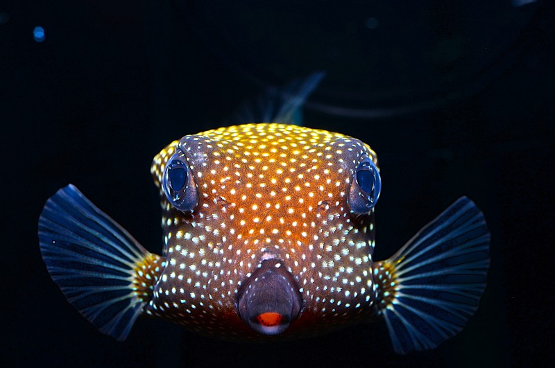 足摺の海のコーナーのクロハコフグの正面顔です。水槽に近づくと餌をおねだりして近寄ってきてこちらを見つめます。離れた大きな眼と口先が可愛いですね。黒い体に白の小斑点、これもいい味を出しています。