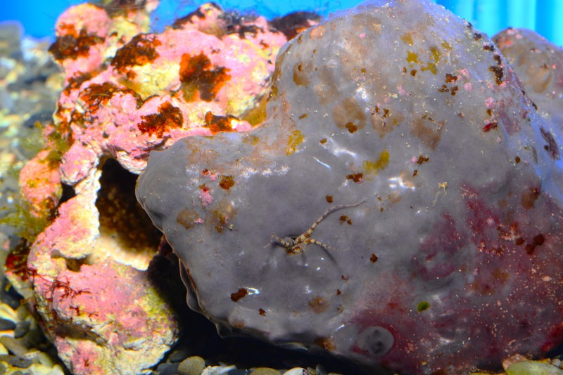 ウミウシコーナーのアオウミウシなどが展示されている水槽に、灰色のカイメンも一緒に展示されています。そのカイメンに開いている小さな穴から何やら細長いものが出ていました。ようく見ると何か生きもののようです。写真に撮って大きくして見ると、二枚目の写真のようでした。出ていたのは、どうやらクモヒトデの仲間の腕のようです。クモヒトデの仲間は穴から腕だけを出して、流れてくる細かい餌を腕にからめとって食べているのです。生き物たちを観察するのには、マクロな目が必要ですね。