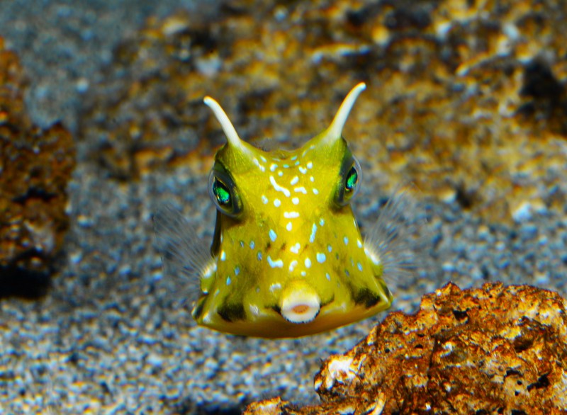 足摺の海のコーナーのコンゴウフグです。四角い体のおでこに一対ある角が大分長くなってきましたよ。水槽で飼育しているとなかなか角が長く伸びないのですが、この個体は順調に伸びています。成長するともっと長くなり、身体と尾鰭が横に長くなるんです。