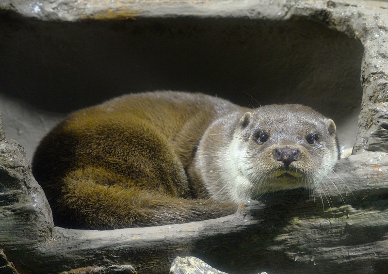 ユーラシアカワウソの「陸」が少し眠たそうな顔でこちらを見つめていたので、パチリ!たっぷりと寝たのか、体の毛もすっかり乾いていい感じ。凄く暖かそうな毛並みですね。一度、一緒に寝てみたいなぁ。