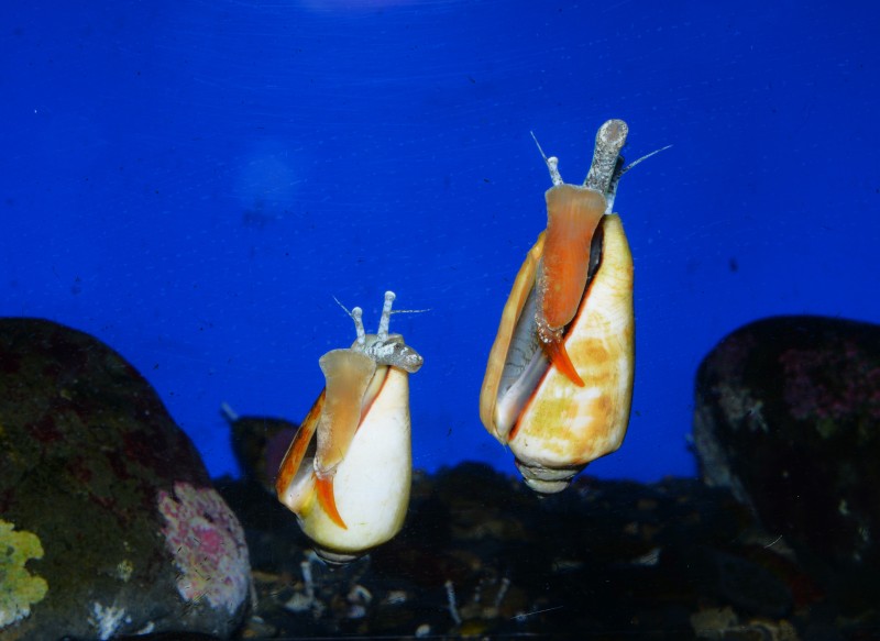 黒潮の恵みのコーナーでマガキガイが二匹並んで、アクリル面に付いていました。同じポーズですが、長く伸びた口を見ると、右側の個体は真っ直ぐに、左側の個体は右に曲げています。この伸びた口の先で、小さな藻類をなめるようにして削り取って食べています。アクリルに吸いついている足の部分がとても綺麗ですね!