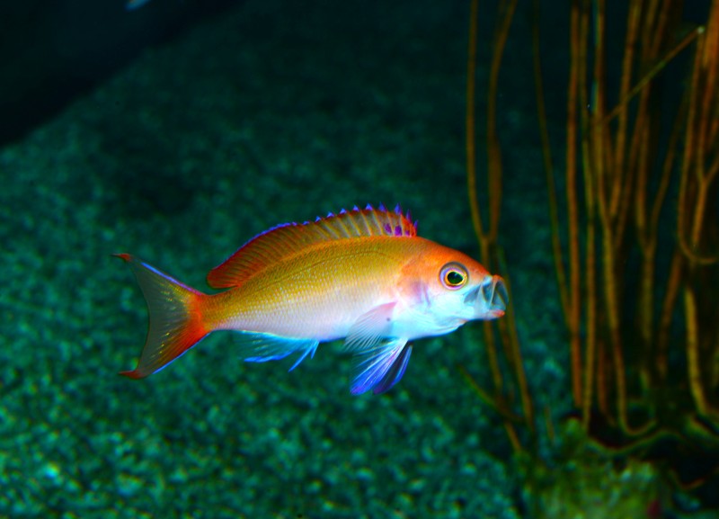 サンゴコーナーに入ってすぐの水槽に、オレンジ色の小さな金魚のような魚たちが群れています。キンギョハナダイの幼魚たちです。ほんとに可愛らしく金魚すくいのキンギョのようです。大きな眼が印象的ですね。写真をようく見ると、下から二番目の個体、口を大きく開けて、鰭を目一杯広げているんです!