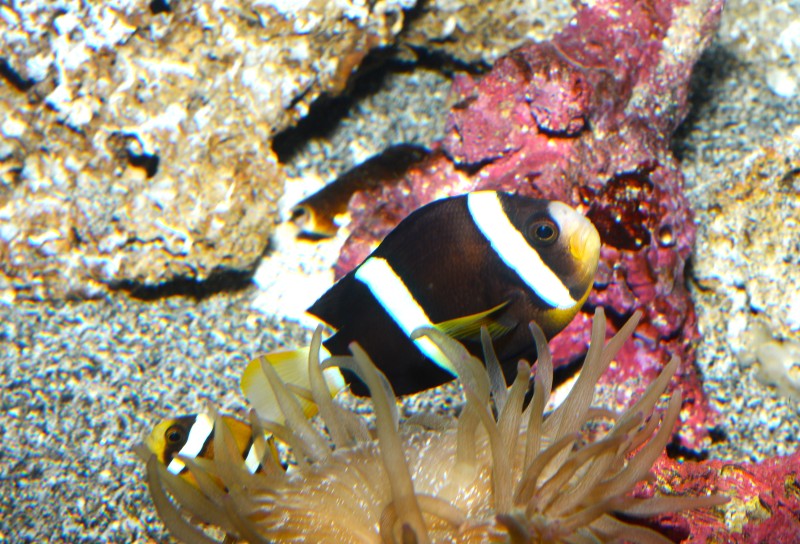 足摺の海のコーナーに茶褐色のクマノミが展示されています。多くのクマノミはオレンジ色がかった茶色の体ですが、時々写真のように濃い体色のものがいます。昔は、その体色からクマノミとは別種とされてモンツキクマノミと呼ばれていました。さらにもう少し体色が違う個体をクマノミモドキと呼んでいて、一種に3つの和名がありました。