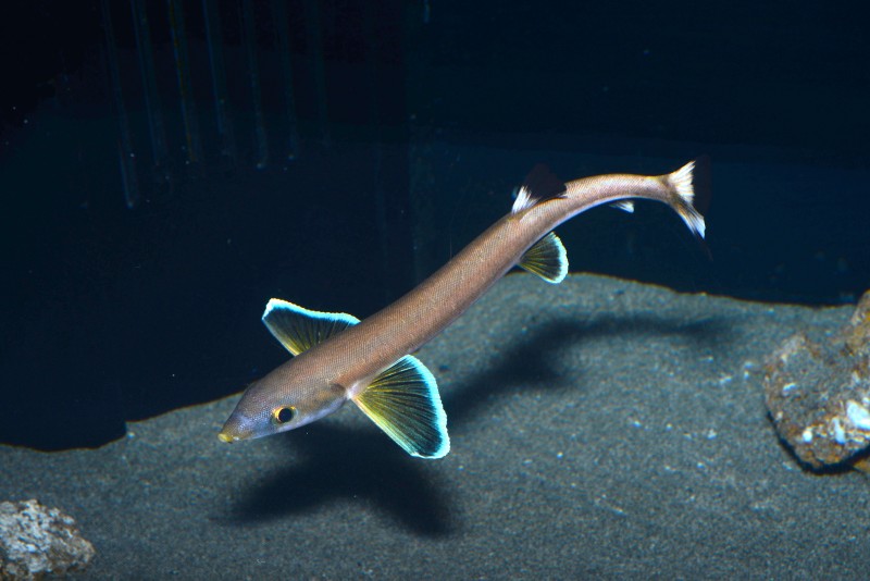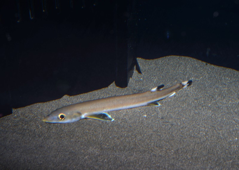 深海コーナーに展示されているネズミギスです。砂に潜る習性があるので、いつもは潜っていてなかなか姿を見ることができません。今朝は珍しく砂の上でジッとしていましたので写真に収めました。細長い体は固くて小さな鱗でおおわれています。顔先が尖っていてその下に一本の短い髭があり、ネズミの顔によく似ています。日中はほとんど砂に潜っているので、その姿を見ることのできた方はラッキーですよ!!