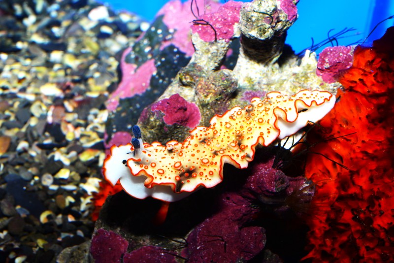 ウミウシコーナーに小型のウミウシたちが続々と展示されていますよ!今日紹介するショウジョウウミウシは体長1㎝程の小さなウミウシです。老眼の僕には、なかなかはっきりと見えないのですが、写真に撮ってみると何とカッコのいいウミウシなんでしょう。長く伸びた触角が素晴らしい!