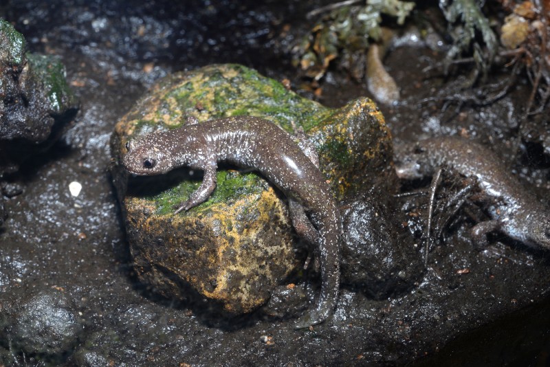 今朝は足摺の原生林のコーナーで、トサシミズサンショウウオが石の上でいいポーズをとっていたので写真に収めました。大きな眼で何かをジッと見つめている横顔が、なんともいいですね!可愛いなぁ!!