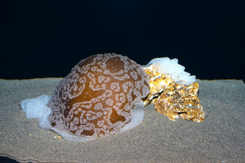 昨年末、宿毛でサンゴ漁をされている漁師さんから寄贈された深海性のウミウシが展示されています。写真の個体ですが大きさは約8㎝と大型です。沖縄の美ら海水族館からも深海で見つかったウミウシとして報告されていますが、まだ和名はないようです。モザイクウミウシ属の一種とまでしかわかりません。この仲間はSATOUMIの地先からはキスジカンテンウミウシなどが収集されています。たぶん、日本ではここだけの展示ではないかと思われます、一見の価値ありですよ!